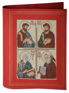 Copertina in vera pelle per lezionari con scritte in trancia oro. Al centro un’immagine in tessuto jacquard, ottenuta dall’intreccio di fili colorati e dorati lavorati al telaio, raffigurante i quattro evangelisti. La copertina è interamente prodotta e confezionata in Italia con certifi cazione di vera pelle di qualità Made in Italy.