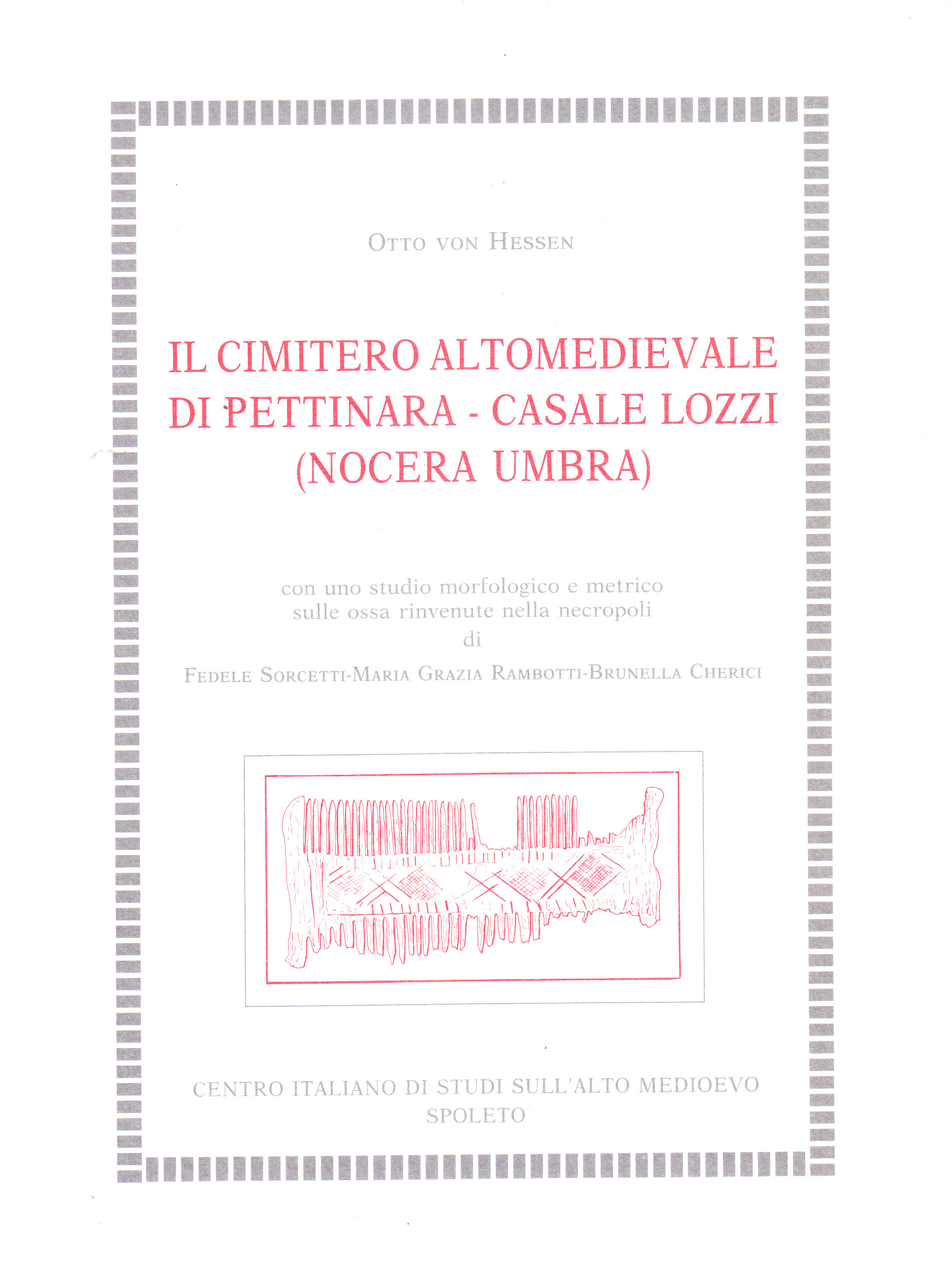 Indice: C. Leonardi, Prefazione alla ristampa - C. Leonardi, Premessa - O. Von Hessen, Il cimitero altomedievale di Pettinara-Casale Lozzi (Nocera Umbra) - Prefazione - Abbreviazioni bibliografiche - Introduzione - 1. Il cimitero - 2. Le tombe - 3. I ritrovamenti - 4. Valutazione dei reperti - Conclusioni: le necropoli di Nocera - Il Catalogo - F. Sorcetti-M. G. Rambotti-B. Cherici, Studio morfologico e metrico sulle ossa rinvenute nella necropoli di Pettinara (Nocera Umbra). Diagnosi tipologica e antropotassonomica dei reperti - Introduzione - Determinazione del tipo morfologico e attribuzione al gruppo popolazionistico (diagnosi antopotassonomica) - Descrizione dei resti scheletrici contenuti nelle singole tombe - Conclusioni - Bibliografia - Metodica impiegata - Accertamento del numero dei soggetti in toto e per ciascuna tomba - Diagnosi di sesso - Determinazione della statura - Valutazione approssimativa dell'età del soggetto al momento del decesso.