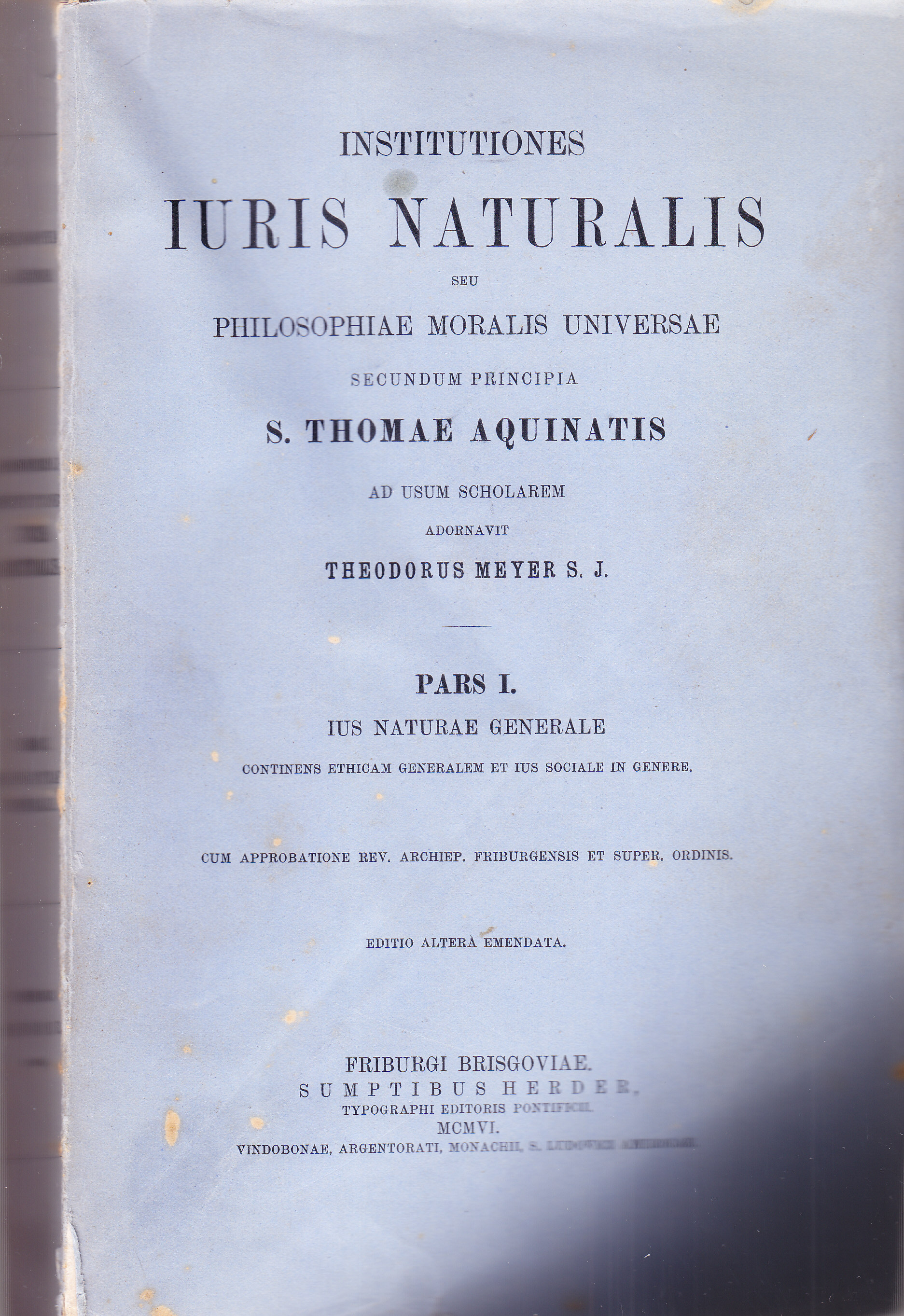 TITOLO/DENOMINAZIONE: Institutiones Iuris Naturalis seu Philosophiae Moralis Universae secundum principia S. Thomae Aquinatis. Pars I. Ius Naturae Generale continens ethicam generalem et ius sociale in genere