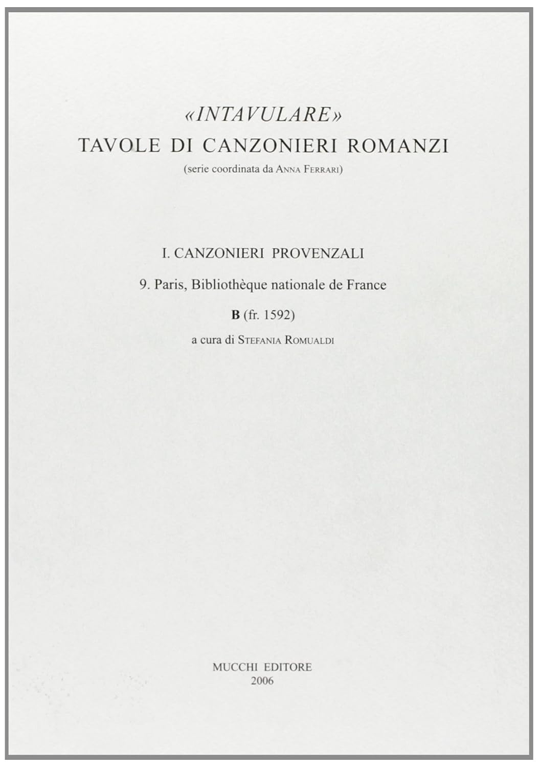 "Intavulare". Tavole di canzonieri romanzi. Canzonieri provenzali 9. Paris, Bibliothèque Nationale de France, B (fr. 1592)