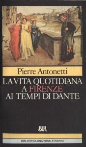 Tra la fine del 1200 e la prima metà del 1300 Firenze era una delle più grandi e prospere città D'Europa. Aveva 100 mila abitanti, quanti ne contava Parigi e il doppio di Londra. Era un centro economico fiorentissimo, i suoi mercanti e i suoi banchieri erano presenti in tutta Europa, in Oriente e nell'Africa del Nord. Attraverso la lettura di Dante sappiamo tutti qualcosa della vita politica del tempo, soprattutto delle aspre contese tra il partito dei guelfi e quello dei ghibellini. Antonetti ci racconta diffusamente la vita quotidiana, come vivevano l'aristocrazia, la borghesia e il popolo e come funzionavano le magistrature e le corporazioni artigiane. Come avvenivano i fidanzamenti e i matrimoni, come venivano celebrate le feste popolari di San Giovanni e di Calendimaggio. Ha inizio in questo periodo il grande sviluppo artistico di Firenze (Giotto esegue gli affreschi in Santa Croce e disegna il progetto del Duomo), che farà di questa città un modello esemplare di civiltà.