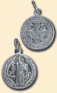 Le origini della medaglia di San Benedetto sono antichissime. Papa Benedetto XIV ne ideò il disegno e col "Breve" del 1742 approvò la medaglia concedendo delle indulgenze a coloro che la portano con fede. Sul diritto della medaglia, San Benedetto tiene nella mano destra una croce elevata verso il cielo e nella sinistra il libro aperto della santa Regola. Sull'altare é posto un calice dal quale esce una serpe per ricordare un episodio accaduto a San Benedetto: il Santo, con un segno di croce, avrebbe frantumato la coppa contenente il vino avvelenato datogli da monaci attentatori. Attorno alla medaglia, sono coniate queste parole: "EIUS IN OBITU NOSTRO PRESENTIA MUNIAMUR" (Possiamo essere protetti dalla sua presenza nell'ora della nostra morte). Sul rovescio della medaglia, figura la croce di San Benedetto e le iniziali dei testi. Questi versi sono antichissimi. Essi appaiono in un manoscritto del XIV sec. A testimonianza della fede nella potenza di Dio e di San Benedetto. La devozione della Medaglia o Croce di San Benedetto, divenne popolare intorno al 1050, dopo la guarigione miracolosa del giovane Brunone, figlio del conte Ugo di Eginsheim in Alsazia. Brunone, secondo alcuni, fu guarito da una grave infermità, dopo che gli fu offerta la medaglia di San Benedetto. Dopo la guarigione, divenne monaco benedettino e poi papa: è san Leone IX, morto nel 1054. Tra i propagatori bisogna annoverare anche san Vincenzo de' Paoli.