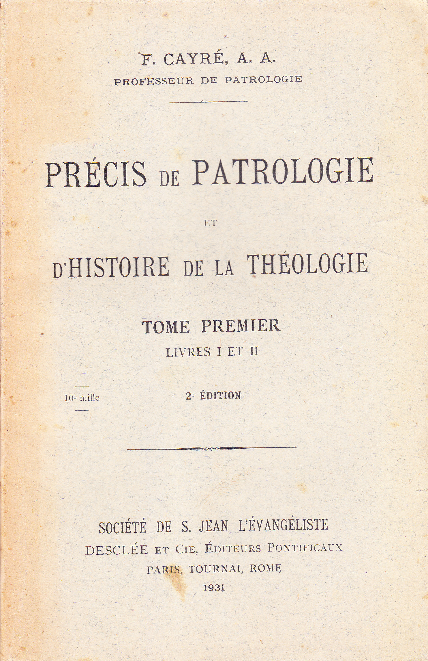TITOLO/DENOMINAZIONE: Précis de Patrologie et d'Histoire de la Théologie. Tome premier, Livres I et II