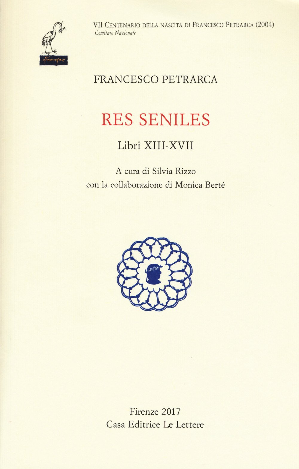 Con questo volume si concludono le Senili nell'ambito dell'edizione di tutto Petrarca promossa dalla Commissione per l'Edizione Nazionale in occasione del centenario del 2004. Il volume abbraccia gli ultimi cinque libri: in un articolo pubblicato recentemente Silvia Rizzo e Monica Berté hanno infatti dimostrato che il XVII è il libro con cui Petrarca ha voluto effettivamente terminare quest'opera, che non è stata quindi lasciata incompleta come prima si pensava (edizioni precedenti hanno perfino aggiunto l'incompiuta lettera alla Posterità come libro XVIII). Il testo latino, costituito sulla base delle collazioni dei testimoni più autorevoli, è accompagnato da un apparato delle fonti e da un apparato critico, nel quale si dà conto delle eventuali varianti d'autore nonché dei problemi testuali più rilevanti, ed ha a fronte una nuova traduzione italiana corredata da note esegetiche, che non di rado recano novità in fatto di datazioni, identificazioni, rapporti con i codici della biblioteca petrarchesca e relative postille, particolarità linguistiche.