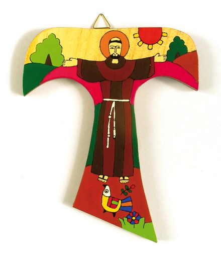 Croce in legno raffigurante San Francesco d'Assisi. I colori sono vivaci e gioviali. L'articolo è frutto del lavoro artigianale di cooperative dell'America latina facenti parte del mercato equosolidale.