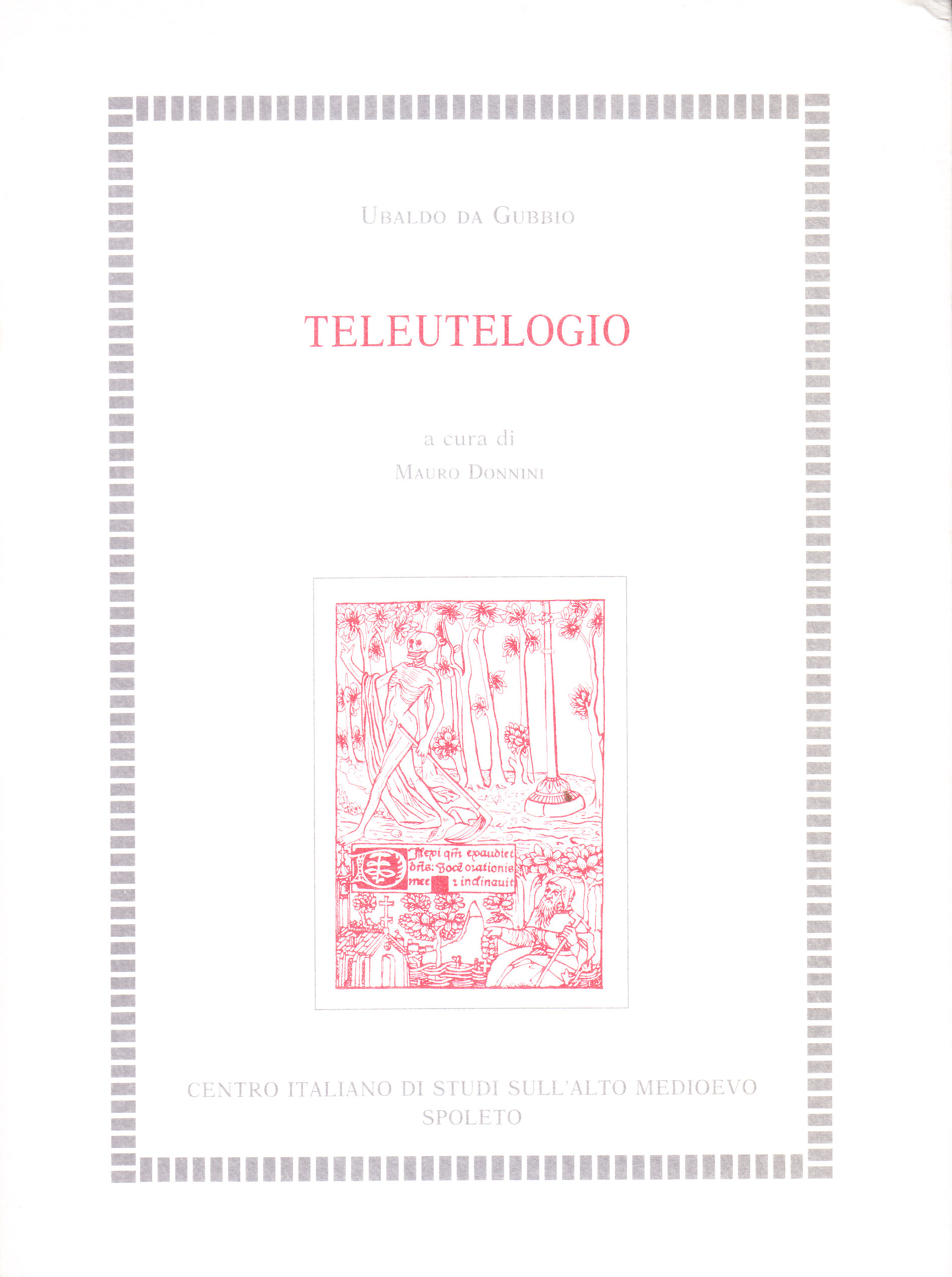 Indice: G. Cremascoli, Prefazione alla ristampa - Introduzione - Manoscritti - Autore - Titolo e dedicatario - Datazione - Contenuto dell'opera - Libro I - Libro II - Libro III - Fonti - Criteri di edizione - Liber de teleutelogio - Codicum conspectus - Liber I: I. Sine titulo - II. De crudelitate mortis - III. De nativitate mortis - IV. De malitia humani generis - V. De biformi facie mortis et eius adulationibus - VI. Utrum alique qualitates hominum ab ictibus mortis eripiant et primo de scientia - VII. De pulchritudine - VIII. De dignitatibus - IX. De fortitudine - X. De nobilitate et divitiis - Liber II: I. De pulchritudine mortis et eius desiderio - II. De similitudine anime humane cum angelis per mortem - III. De contemptu presentis vite et de gloria proveniente per mortem - IV. Ex quot et quibus causis mors proveniat - V. De visione Dei et superne patrie per mortem - VI. De proprietatibus angelorum bonorum et malorum et eorum officiis - Liber III: I. De superbia - II. De avaritia et eius effectibus - III. De luxuria et eius effectibus - IV. De gula et eius effectibus - V. De ira et eius effectibus - VI. De invidia et eius effectibus - VII. De accidia et eius effectibus - VIII. De inobedientia et de mortis remediis - I metri del « Liber de teleutelogio » - Indice dei passi citati - Indice dei nomi.