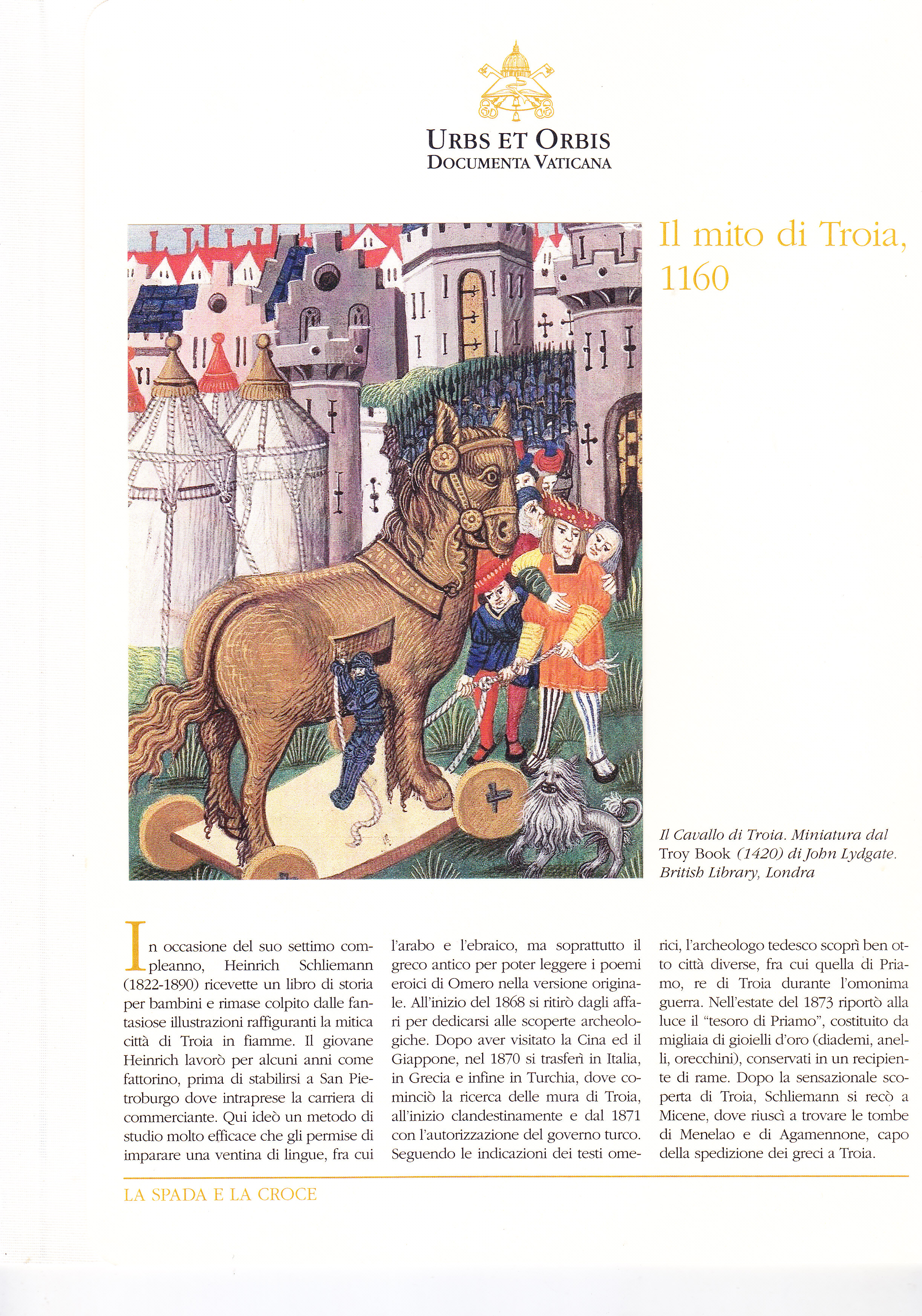 Scheda con spiegazione + 2 documenti (riproduzioni) ripiegati: Benoît de Saint-Maure: Roman de Troie, Biblioteca Apostolica Vaticana, Reg. lat. 1505, f. 23rv; Benoît de Saint-Maure: Roman de Troie, Biblioteca Apostolica Vaticana, Reg. lat. 1505, ff. 141r-142v. Manca il terzo documento (Raoul Lefèvre: Recueil des Histoires de Troie, Biblioteca Apostolica Vaticana, Pal. Lat. 1962, f. 224rv)