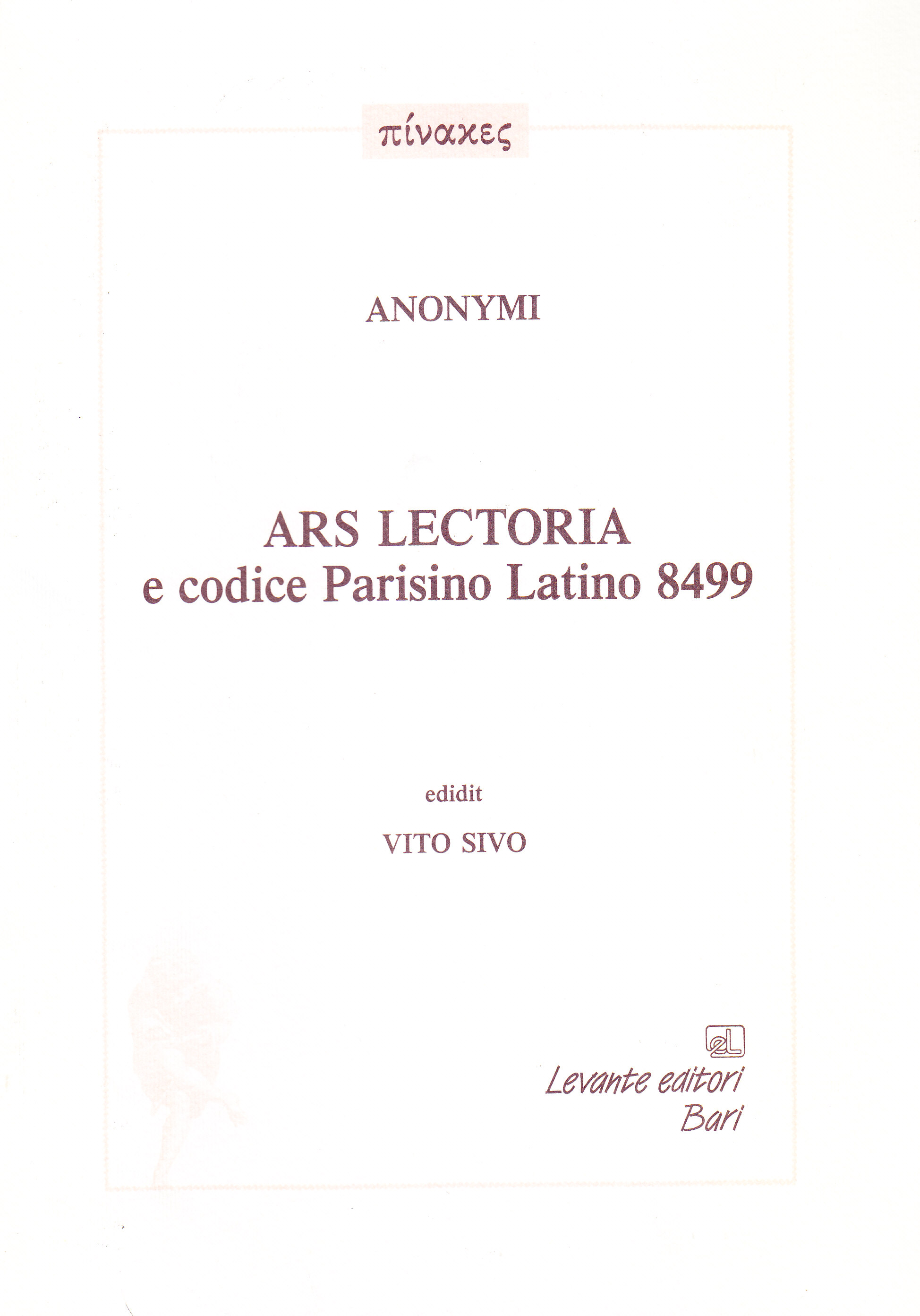 Il volume presenta l'edizione critica di una breve ed anonima Ars lectoria, tràdita da un solo codice parigino del XII secolo. Strettamente imparentata con i già noti trattati di Aimerico di Gastinaux e di Siguinus Magister — anteriori di appena un secolo ed editi entrambi negli anni Settanta — oltre che con altri tuttora inediti, essa ha però un suo rilievo nella mappa di queste Artes lectoriae, perchè ne costituisce un non marginale ramo a sè stante, qua e là essenziale alla ricostruzione dell'antenato comune. Completano il volume un'ampia introduzione filologico-letteraria e tre indici analitici.