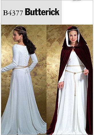 Lined, floor-length cape has hood, gathered neckline and decorative closure. Floor-length dress has close-fitting, lined, drop-waist, shaped bodice, with princess seams, long sleeves, flared skirt with godets and back zipper closing. Purchased trim.