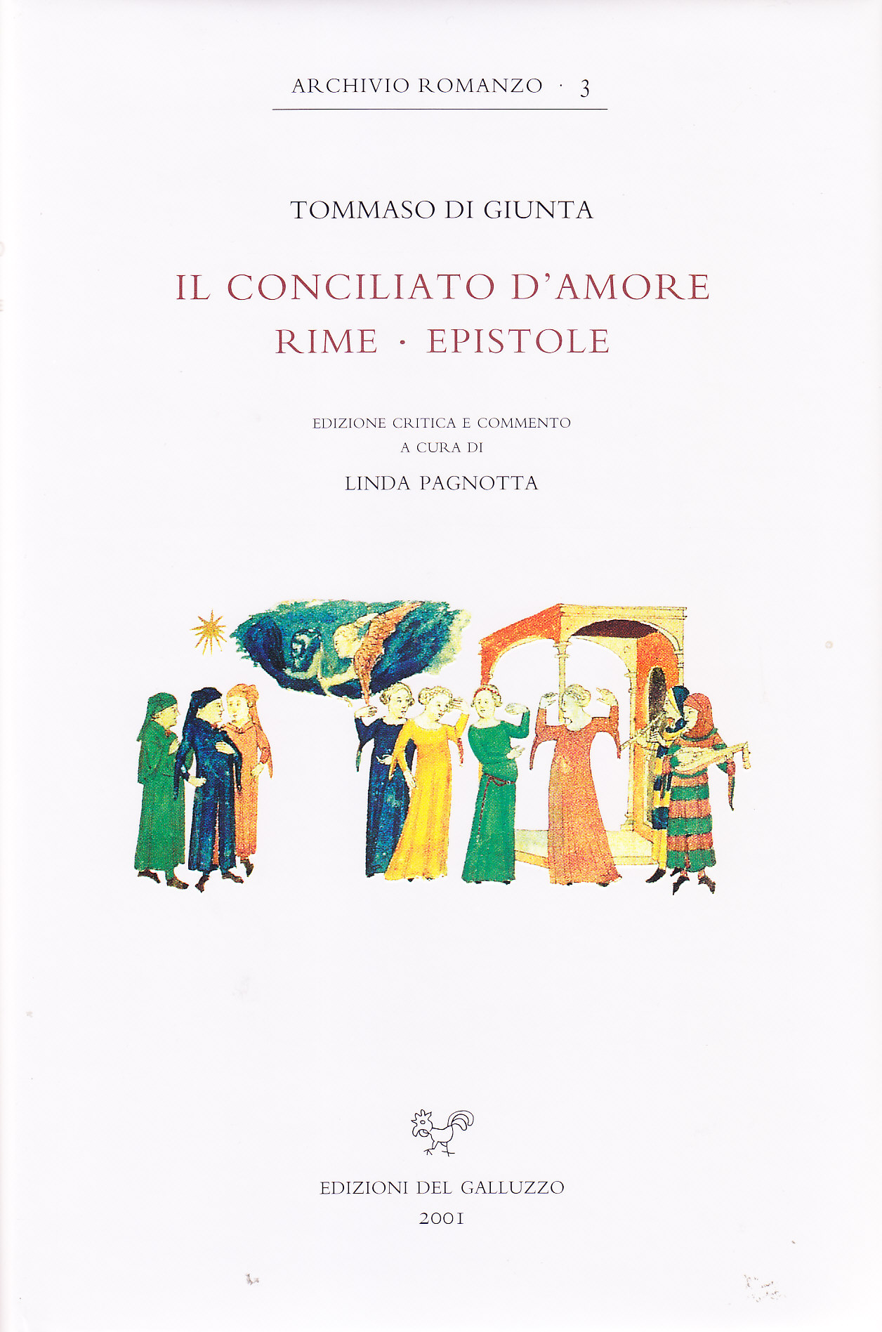 Tommaso di Giunta occupa nel panorama della letteratura in volgare mediotrecentesca una posizione appartata e per molti aspetti singolare: autore di un prosimetro di contenuto didattico-amoroso, il Conciliato d'Amore, che si propone come summa della precettistica cortese elaborata nel corso di un secolo di attività poetica, di epistole in prosa che traspongono in una lingua fortemente condizionata dall'uso lirico i modelli delle artes dictandi, e di rime di corrispondenza, fra cui spicca per impegno ideologico e tecnico la frottola politica responsiva a Fazio degli Uberti - ma dove non mancano anche esercitazioni sul registro 'comico' -, sembra aver affiancato a tale multiforme attività letteraria quella di ideatore e curatore di una raccolta della propria produzione, promuovendo e sovrintendendo alla realizzazione di un vero e proprio 'libro' personale, basato su un'innovativa strategia di impaginazione dei testi poetici e riccamente miniato, identificabile col codice It. IX 175 della Biblioteca Marciana di Venezia. Quella che qui si presenta è la prima edizione critica completa dell'opera di questo autore poco conosciuto, preceduta da uno studio sulla tradizione manoscritta e corredata dalla riproduzione fotografica integrale del manoscritto marciano.