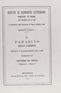 Giovanni Gherardi, detto Giovanni da Prato, nacque probabilmente nel 1367 e morì intorno al 1445. Notaio, poeta, cultore della grande tradizione volgare fiorentina, elaborò anche un progetto per la cupola di S. Maria del Fiore. Nel 1426 si ritirò a Prato dove compose il "Paradiso degli Alberti". L'opera, articolata in cinque libri, ma incompiuta, riferisce dei conversari tenuti nella primavera del 1389 da una lieta brigata fiorentina nella villa del Paradiso, di proprietà di Antonio di Niccolò degli Alberti (da qui il titolo attribuito all'opera dal Wesselofsky, suo primo editore, nel 1867). Un'invenzione, dunque, che ricalca quella del Decameron di Boccaccio, senonché in questo caso il rapporto cornice/novelle vede il prevalere della cornice, che rappresenta la parte preponderante del racconto. In ragione del ruolo secondario delle novelle, nove in tutto, l'opera acquista più la fisionomia del romanzo che non quella del novelliere.