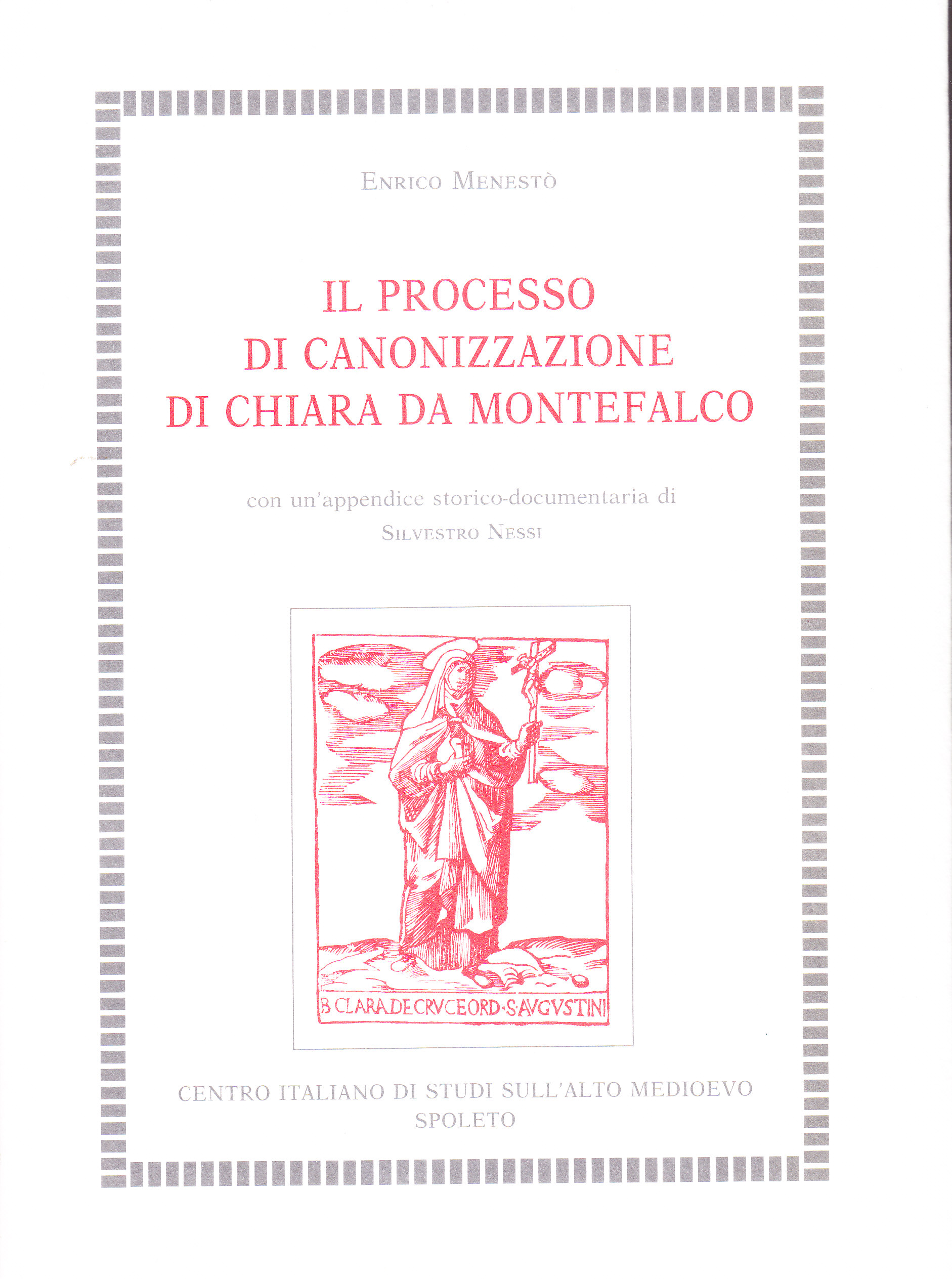 Indice: G. Cremascoli, Prefazione alla ristampa - C. Leonardi, Universalità di Chiara da Montefalco. Ipotesi agiografica e programma editoriale - E. Menestò, Introduzione - I. La canonizzazione di Chiara da Montefalco: 1. La storia del processo - 2. Vicende e sistemazione della documentazione trecentesca - II. La tradizione manoscritta del processo apostolico: 1. I manoscritti - 2. La tradizione - III. Ricostruzione linguistica del testo del processo apostolico: 1. Premessa - 2. Fonetica - 3. Fenomeni di attestazione limitata - 4. Morfologia e sintassi - 5. Fatti grafici - 6. Particolarità lessicali - 7. Termini ed espressioni in volgare - IV. Agiografia e santità: 1. Per una lettura del processo di canonizzazione di Chiara - 2. La santità di Chiara - V. Criterî di edizione: Inquisitio processus canonizationis Clarae de Cruce Montifalconis Ordinis sancti Augustini († 17.VIII 1308) ab 6.IX.1318 ad VII.1319 facta. Testo - S. Nessi, Appendice storico-documentaria - 1. Montefalco al tempo di s. Chiara - 2. Le « Religiosae Mulieres » della diocesi di Spoleto nei secc. XIII-XIV - 3. Dal reclusorio di Damiano al monastero di s. Croce e s. Caterina - 4. La famiglia di Chiara - 5. Schede documentarie - S. Nessi, Appendice bibliografica - 1. Indice dei nomi di persona - 2. Indice dei nomi di luogo e delle cose notevoli.