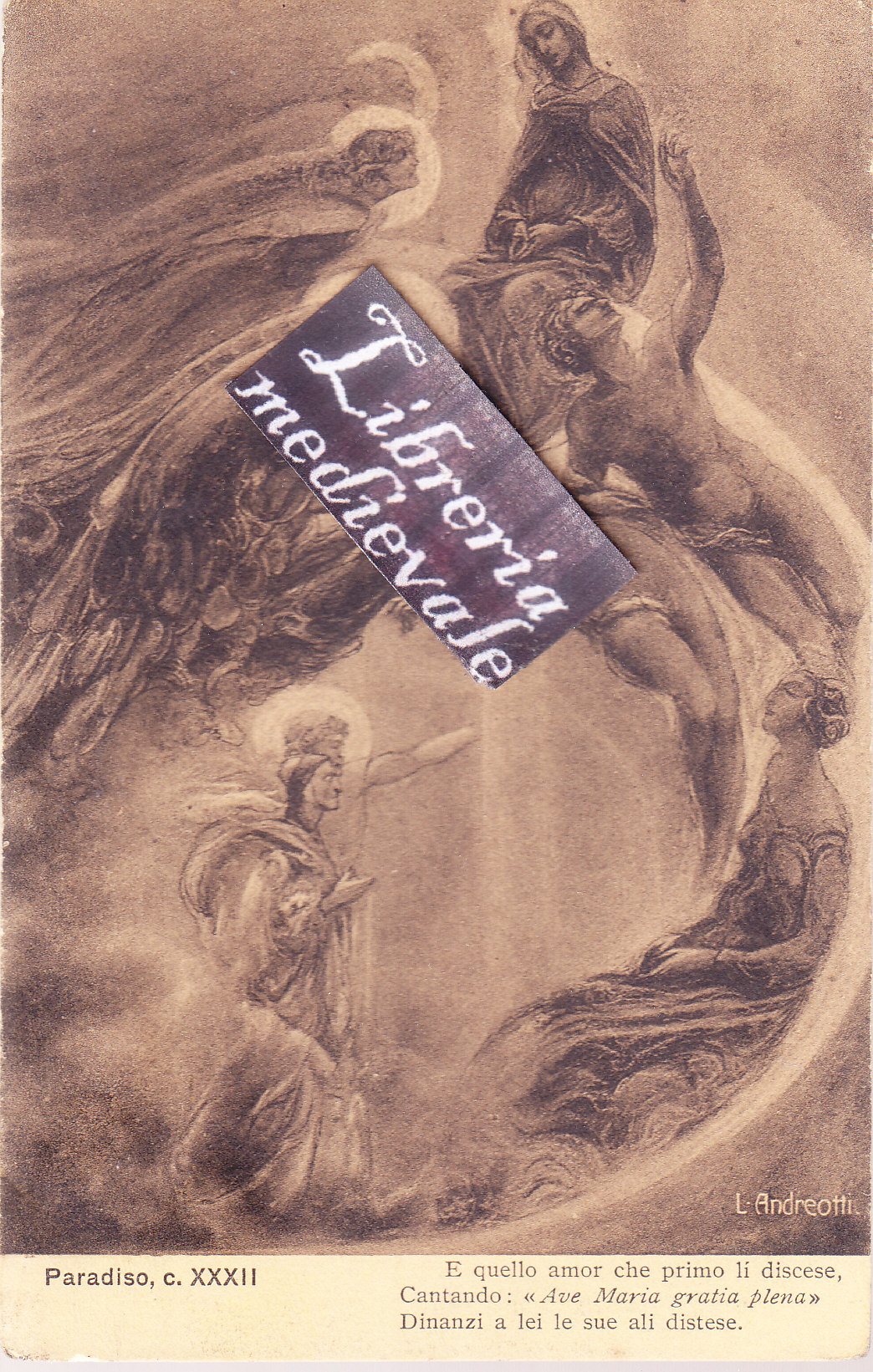 TITOLO/DENOMINAZIONE: Paradiso, c. XXXII. E quello amor che primo lì discese, Cantando: "Ave Maria gratia plena" Dinanzi a lei le sue ali distese - CARTOLINA
