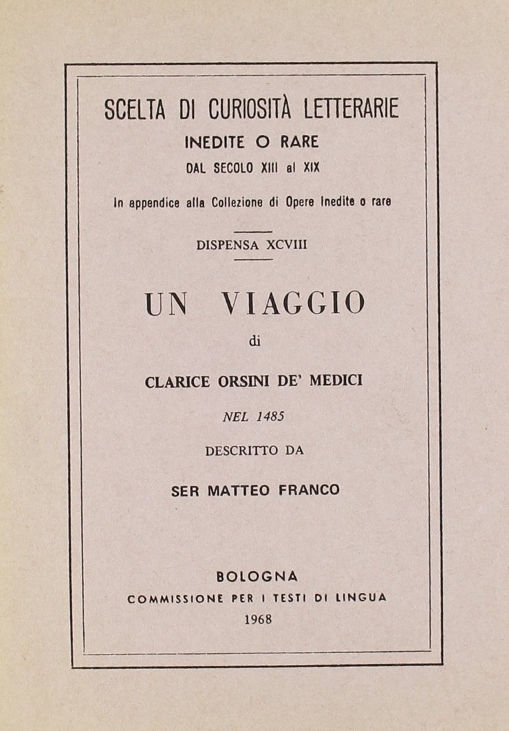 Descrizione di uno dei molti viaggi compiuti da Clarice Orsini (Roma, 1453 circa – Firenze, 30 luglio 1488), nobildonna italiana, famosa soprattutto per essere stata la moglie di Lorenzo il Magnifico e la madre di Papa Leone X.